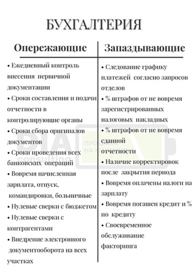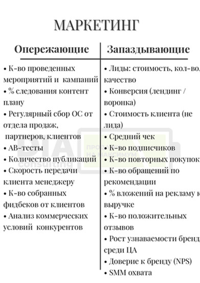 Наша команда подготовила для Вас чек лист по опережающим и запаздывающим показателям. Для разных отделов: